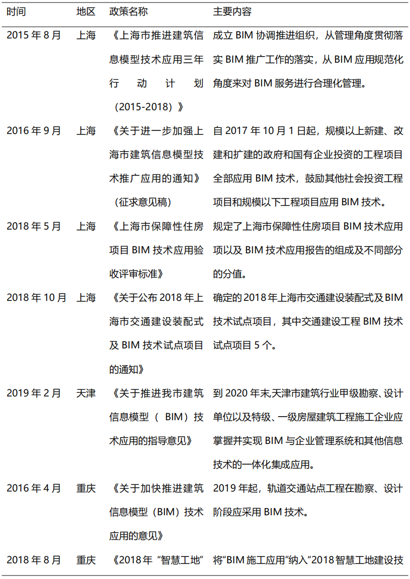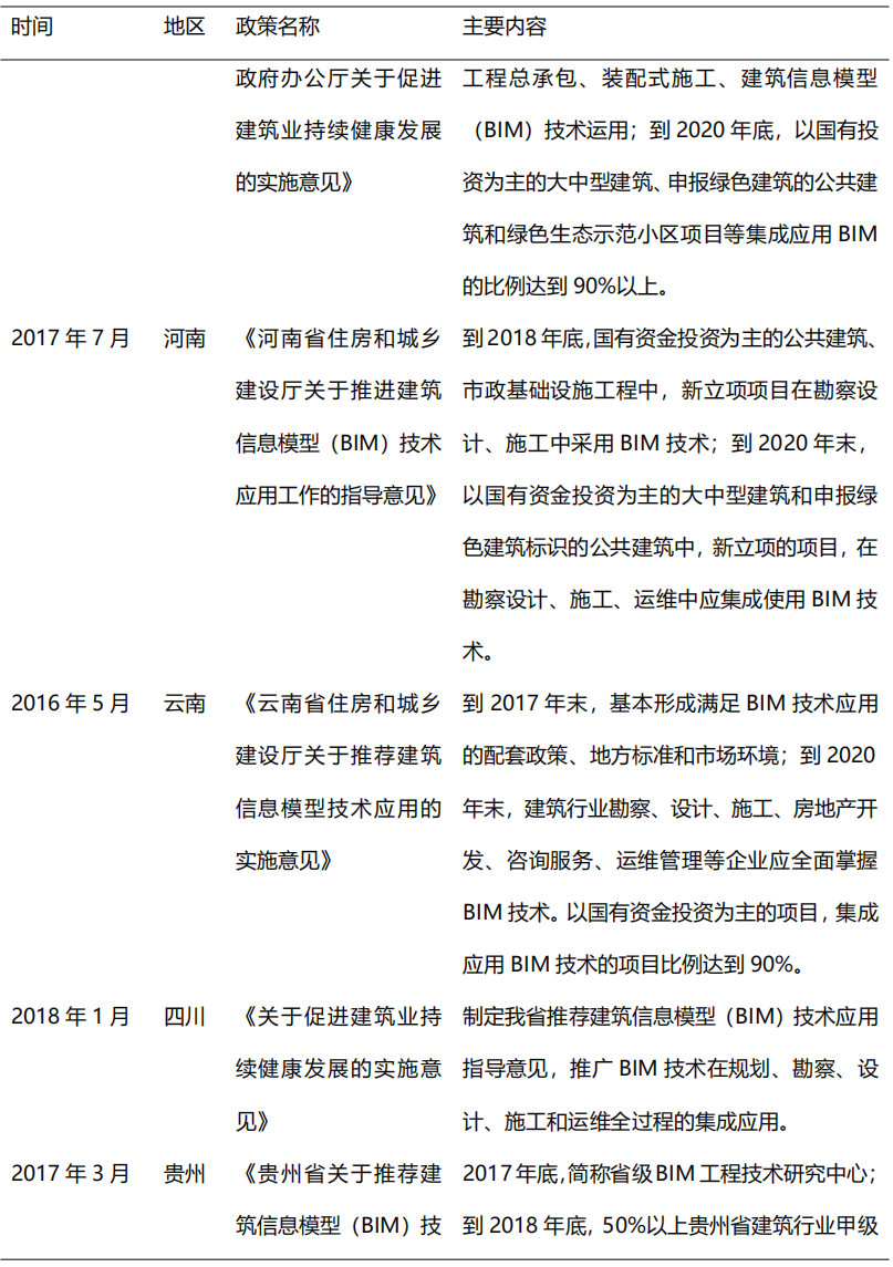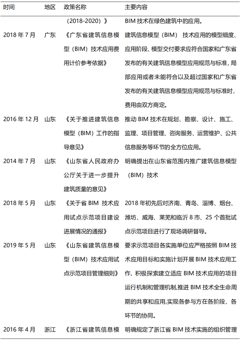 從2014年開始,在住建部的大力推動下,各省市政策相繼出臺BIM推廣應用文件,到目前我國已初步形成BIM技術應用標準和政策體系,為BIM的快速發展奠定了堅實的基礎。2017年,貴州、江西、河南等省市正式出臺BIM推廣意見,明確提出在省級范圍內提出推廣BIM技術應用。2018-2019年,各地政府對于BIM技術的重視程度不減,重慶、北京、吉林、深圳等多地政策出臺指導意見,旨在推動BIM技術進一步應用普及。隨著我國出臺BIM推廣意見的省市數量逐漸增多,全國BIM技術應用推廣的范圍更加廣泛。表2列舉了部分重要地方鼓勵政策。