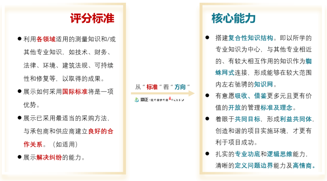通過此次評獎申報過程中的思考與體會,我們想從RICS中國獎評分標(biāo)準(zhǔn)談?wù)勴椖拷?jīng)理的努力方向。無論是投資決策咨詢、規(guī)劃設(shè)計,還是政府采購與招標(biāo)代理、工程造價咨詢、工程監(jiān)理及項目管理咨詢的項目經(jīng)理,都需要明確?優(yōu)秀的項目管理是什么樣的?要實現(xiàn)這些成果需要培養(yǎng)并精進(jìn)哪些核心能力?