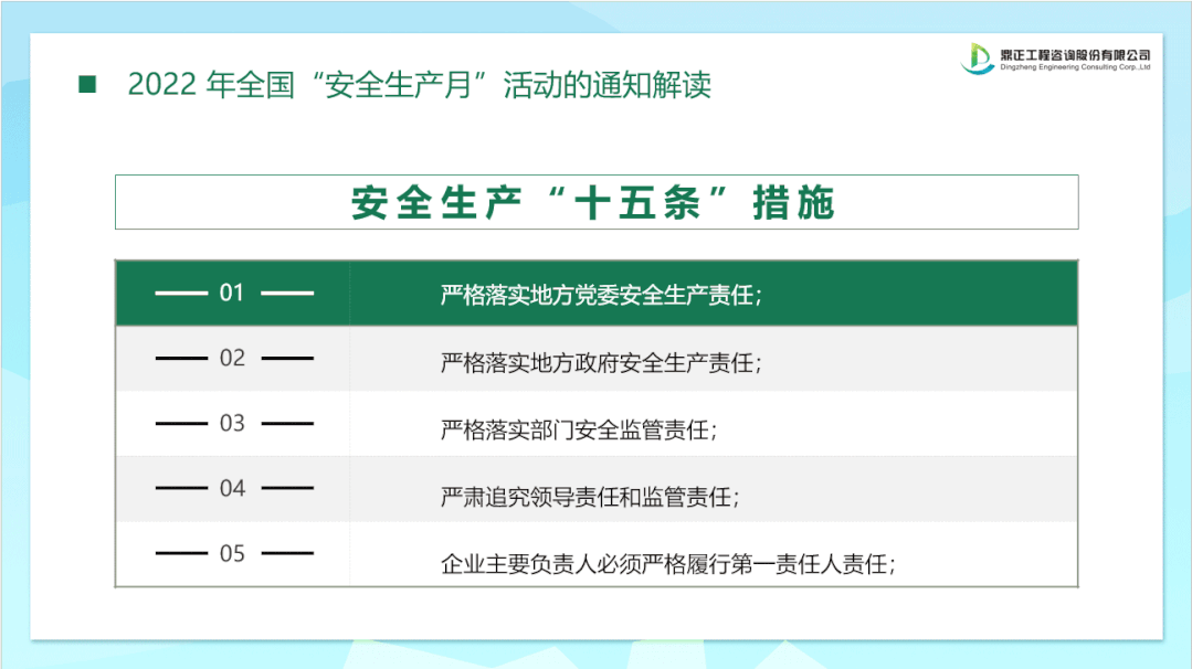 2022年全國“安全生產(chǎn)月”重點(diǎn)工作要求,1.深入學(xué)習(xí)貫徹習(xí)近平總書記關(guān)于安全生產(chǎn)重要論述,推動(dòng)落實(shí)安全生產(chǎn)十五條措施;2.宣傳貫徹安全生產(chǎn)法,推動(dòng)“第一責(zé)任人”守法履責(zé);3.持續(xù)開展“安全生產(chǎn)萬里行”活動(dòng),分類強(qiáng)化警示教育;4.廣泛開展“安全宣傳咨詢?nèi)铡焙桶踩麄鳌拔暹M(jìn)”活動(dòng),提升社會(huì)公眾安全意識(shí)和自救互救能力。