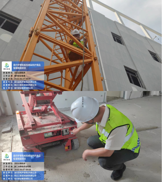 6月7日,醫(yī)療護(hù)理和疾控感染防護(hù)用品智能制造項(xiàng)目總監(jiān)理工程師陳雄對(duì)施工現(xiàn)場進(jìn)行塔吊、物料提升機(jī)、施工升降機(jī)、吊籃、臨時(shí)用電進(jìn)行聯(lián)合檢查,現(xiàn)場抽檢施工單位的安全生產(chǎn)規(guī)范。此次檢查以安全生產(chǎn)細(xì)化管理為要求,以查隱患、找短板、促整改、防事故為目的。安全是確保工程質(zhì)量的前提條件,質(zhì)量是建設(shè)單位所追求的最終目標(biāo),安全則是實(shí)現(xiàn)這一目標(biāo)的基本環(huán)境條件,安全監(jiān)理是這一環(huán)境條件的保護(hù)神。