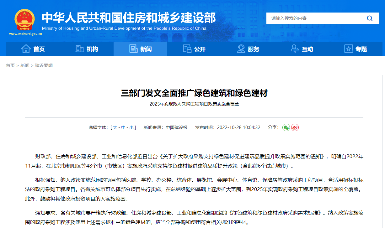財(cái)政部、住房和城鄉(xiāng)建設(shè)部、工業(yè)和信息化部近日出臺(tái)《關(guān)于擴(kuò)大政府采購支持綠色建材促進(jìn)建筑品質(zhì)提升政策實(shí)施范圍的通知》,明確自2022年11月起,在北京市朝陽區(qū)等48個(gè)市(市轄區(qū))實(shí)施政府采購支持綠色建材促進(jìn)建筑品質(zhì)提升政策(含此前6個(gè)試點(diǎn)城市)。根據(jù)通知,納入政策實(shí)施范圍的項(xiàng)目包括醫(yī)院、學(xué)校、辦公樓、綜合體、展覽館、會(huì)展中心、體育館、保障房等政府采購工程項(xiàng)目,含適用招標(biāo)投標(biāo)法的政府采購工程項(xiàng)目。各有關(guān)城市可選擇部分項(xiàng)目先行實(shí)施,在總結(jié)經(jīng)驗(yàn)的基礎(chǔ)上逐步擴(kuò)大范圍,到2025年實(shí)現(xiàn)政府采購工程項(xiàng)目政策實(shí)施的全覆蓋。