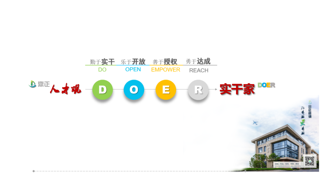 鼎正“DOER實干家”人才觀,是我們對人才認知的基本價值觀,亦是人才發展成長的路徑,它能具體化指導同事們在工作中“對于自己、對于他人、對于團隊、對于上級”分別能做些什么、該如何去做,從而調動和培養同事們發展的內驅力和工作的協同性