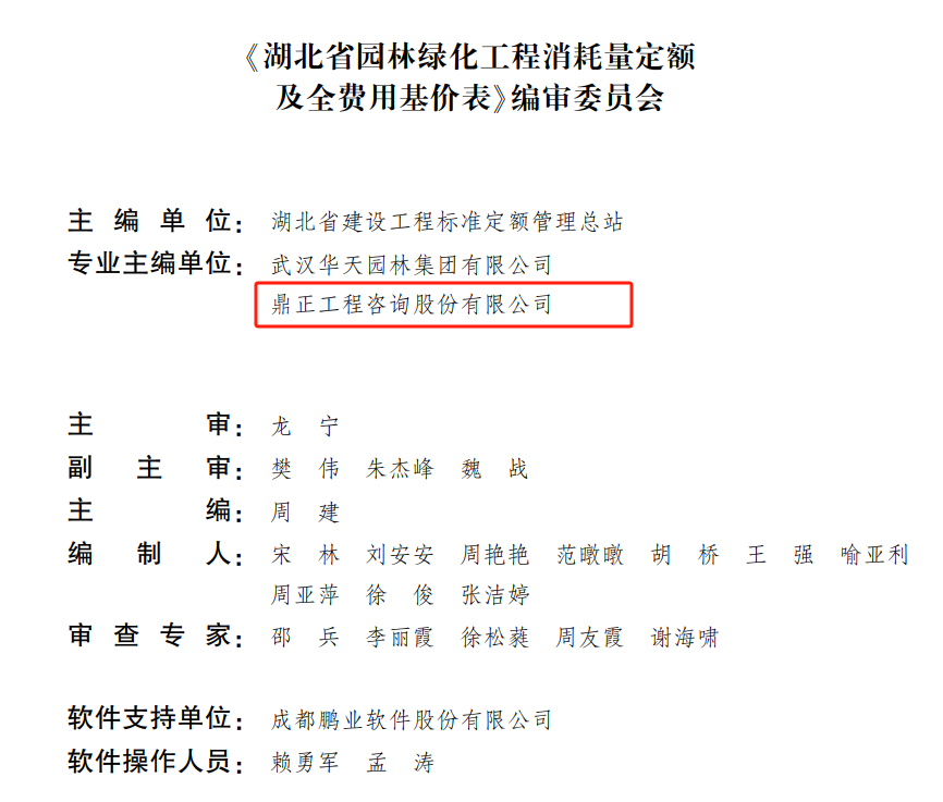 鼎正作為《湖北省園林綠化工程消耗量定額及全費用基價表》《湖北省建筑安裝工程費用定額》的參編單位之一,充分發揮全過程工程咨詢資源集中的優勢,為此次定額的修訂貢獻了鼎正在全過程工程咨詢、工程造價咨詢業務領域編審設計概算、投資估算、工程預算、過程結算、竣工結算等實踐經驗,對進一步完善工程造價計價依據體系提供了有力的技術支撐。