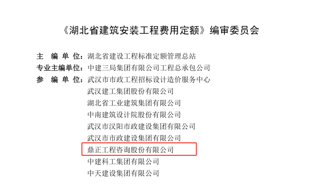 鼎正高度重視標準化工作,多次參與國家、地方及行業標準編制。此次參與《湖北省建筑安裝工程費用定額》《湖北省建筑安裝工程費用定額》的定額編制,既是鼎正多年堅持多年各咨詢板塊專業化沉淀和發展的集中體現,更是鼎正履行推動行業進步、規范建設市場行為的專業職責所在。下一步,鼎正將繼續發揮專業優勢,集結公司更多骨干專家力量,為提升行業整體標準化水平、促進行業的高質量發展貢獻專業力量。