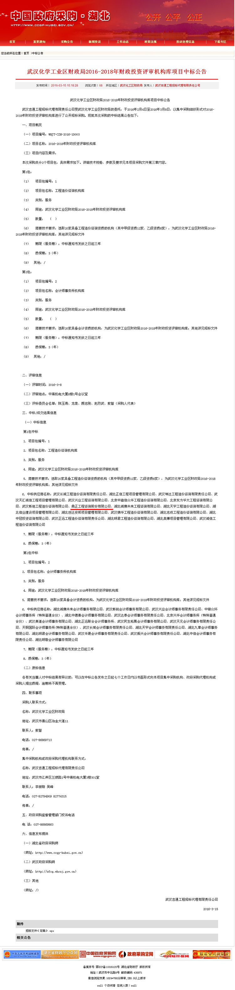 【經(jīng)營成果】我司入圍武漢化學工業(yè)區(qū)財政局2016-2018年財政投資評審機構庫
