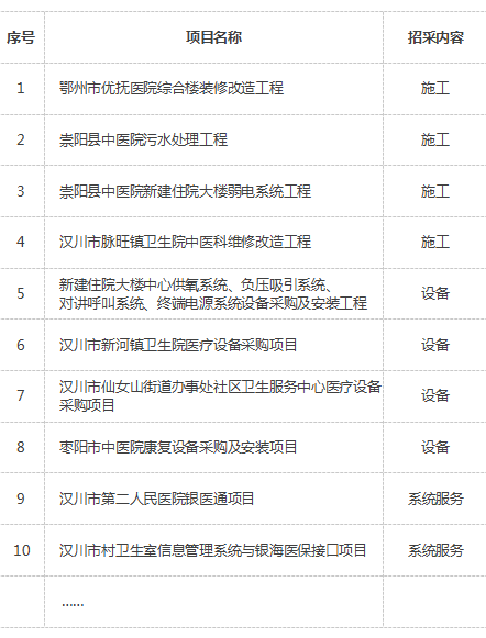 截止目前我司已為鄂州、咸寧、漢川、襄陽等地區(qū)的公立民營醫(yī)院及基層醫(yī)療衛(wèi)生機構(gòu)提供了30多個項目的招采服務(wù)。