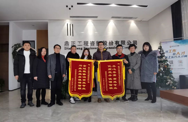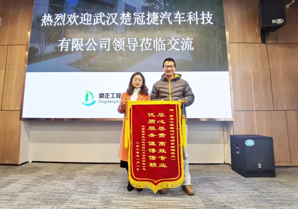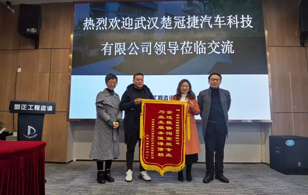 2020年1月14日,武漢楚冠捷汽車科技有限公司龔經理、朱主任蒞臨鼎正咨詢公司,特向為其二期廠房建設項目提供全過程工程咨詢服務的鼎正咨詢團隊及項目負責人程正一贈送錦旗并表達感謝。