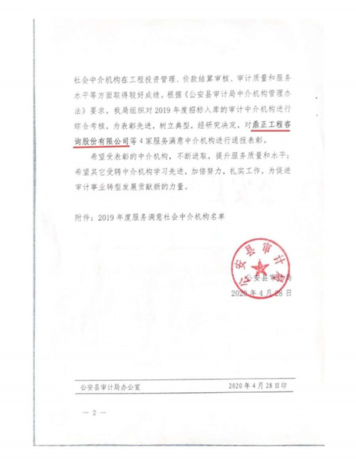 自2019年7月1日鼎正咨詢成為公安縣審計(jì)局的入庫(kù)合作單位以來(lái),荊州分公司同事們?cè)诠こ炭⒐そY(jié)算審計(jì)過(guò)程中,精心組織、合理安排、嚴(yán)于律己、廉潔從審,在確保重點(diǎn)工程順利推進(jìn)、節(jié)約政府資金、提高投資效益等方面做出了突出貢獻(xiàn),得到了公安縣相關(guān)單位的一致好評(píng),為公司贏得了信譽(yù)。